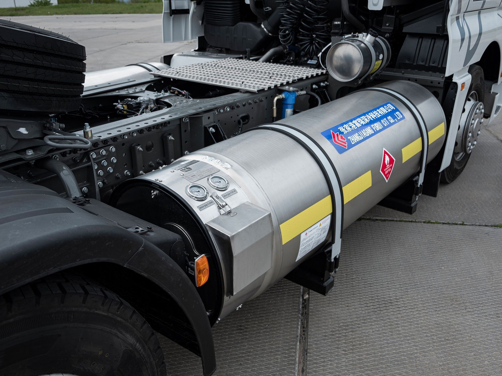 • Тягач в комплектации с двигателем мощностью 430 л.с., механической коробкой передач с ретардером, колесной базой 3900 мм и высотой седла 1150 мм. Работает на сжиженном природном газе СПГ (LNG);